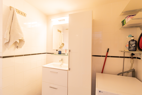 The modern bathroom is equipped with a bathtub with shower and a double sink with vanity unit. The toilet is separate from the bathroom and accessible via the hallway. Beautiful oak laminate flooring runs throughout the entire apartment, creating a warm and well-maintained appearance.