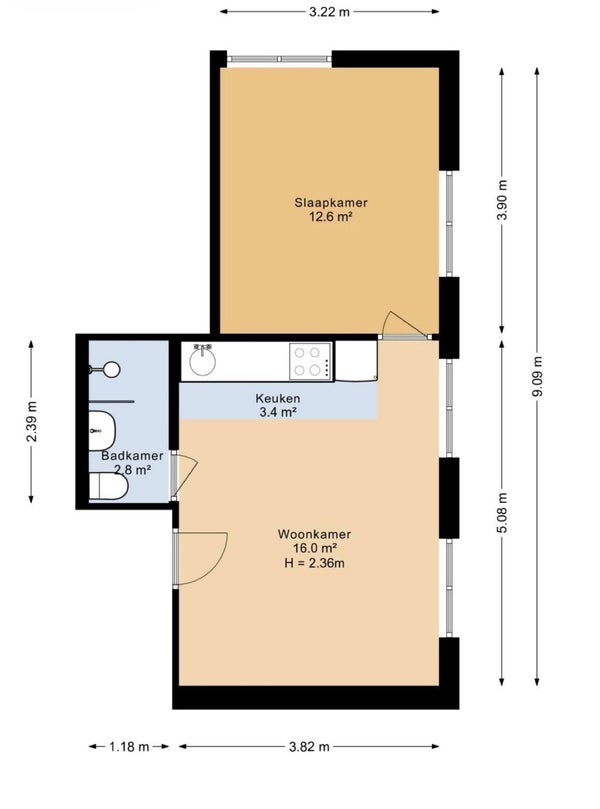 The apartment consists of a living room with a kitchenette, a separate bedroom, and a bathroom with a shower, toilet, and sink.