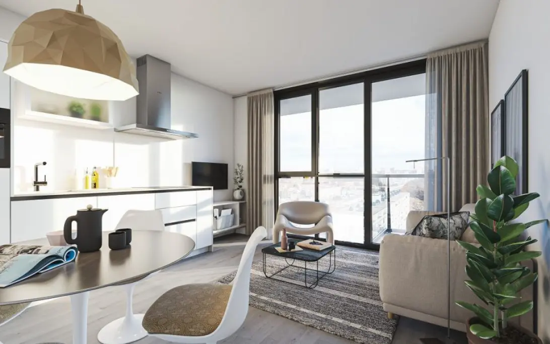 This unique 2-room apartment on the 16th floor at Biesbosch 739 offers stunning views and excellent southern sun exposure. Covering an area of 56.4 m², it includes a spacious living room with a luxury open kitchen and a delightful outdoor space. The bedroom is large enough for a wardrobe, a double bed, and a study corner. The apartment features a modern bathroom with high-quality fixtures, a separate toilet, and a storage area for technical appliances and washer/dryer hookups. Additionally, there is underfloor heating and cooling, a PVC floor, and a communal bike shed. An optional parking space is available for rent. The monthly rent is €1,800, with additional costs of €75.