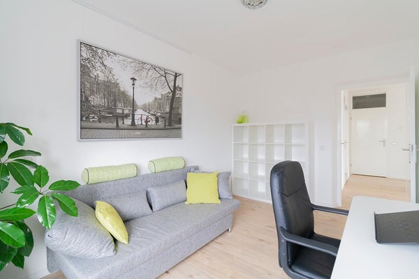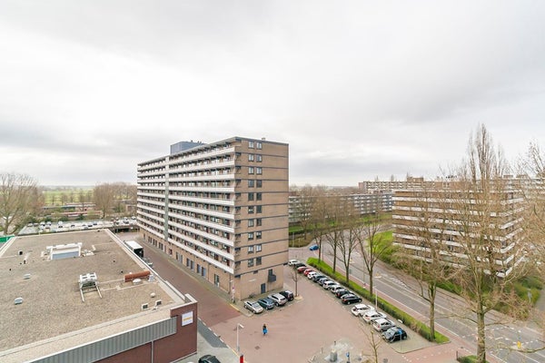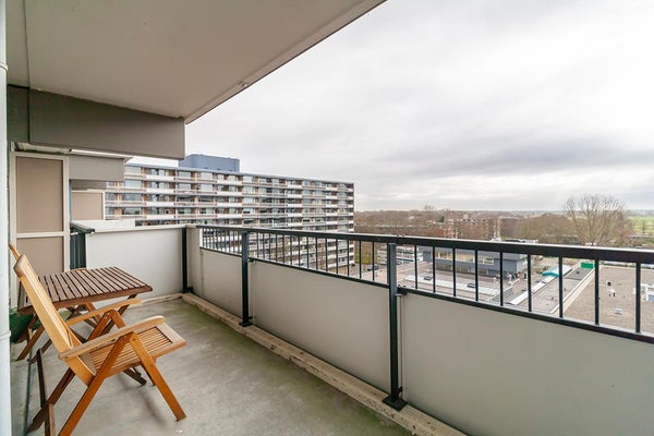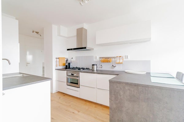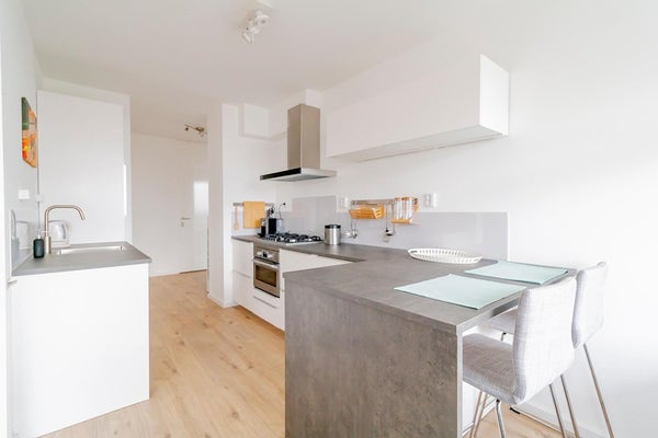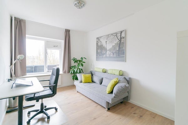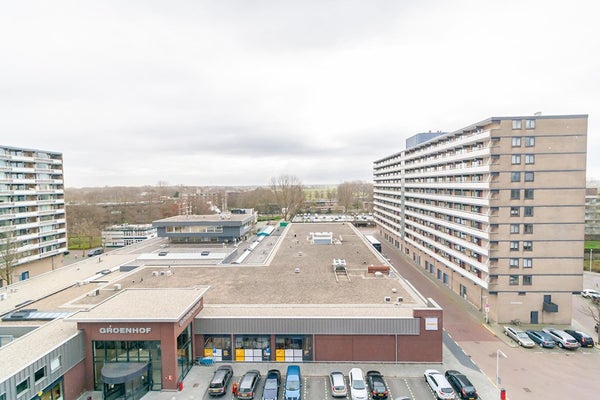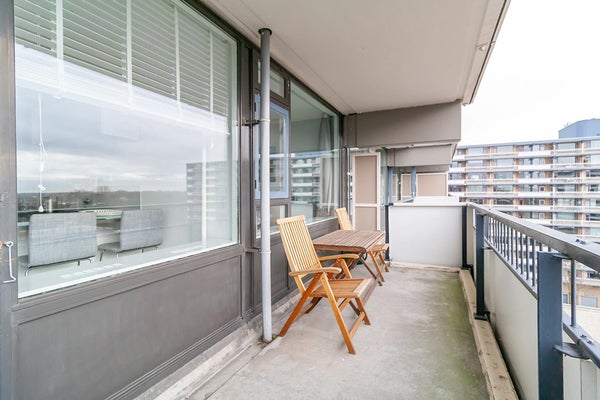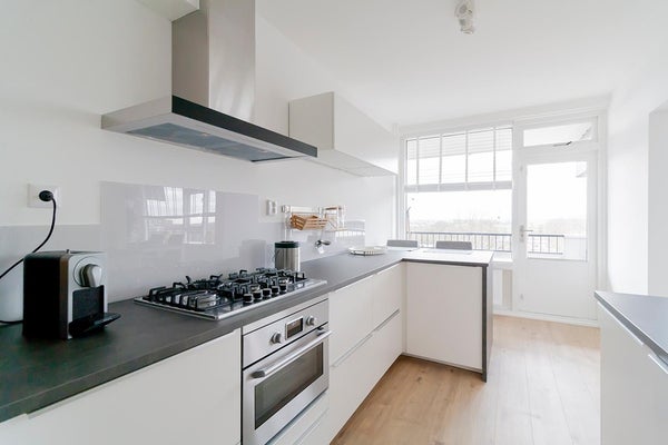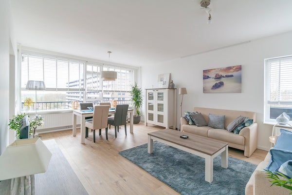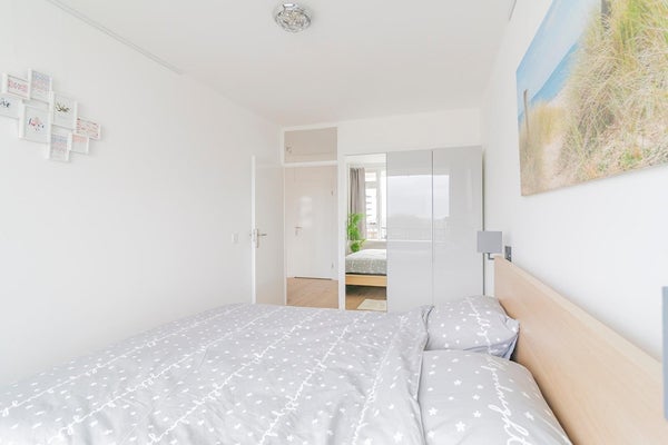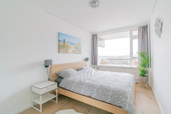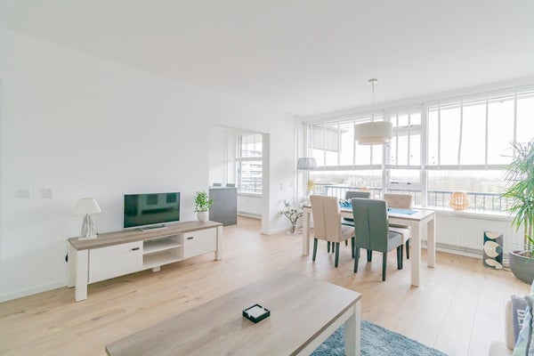 The apartmentcomplex "Stratus" is located in the quiet residential area Groenelaan. The house is located on the 7th floor and is accessible via stairs and elevator. The apartment was completely renovated in 2020. All areas are accessible from the entrance / hall. The living room is spacious and thanks to the many large windows it is very light. The spacious balcony is accessible from the kitchen. The kitchen is also accessible from the living room. The new kitchen is fully equipped, such as a combi oven, fridge-freezer, extractor hood, 5-burner hob and a dishwasher. The master bedroom has a double bed and a spacious wardrobe. The second bedroom has a desk, sofa bed and a closet. The spacious bathroom is beautifully finished and is equipped with a walk-in shower with infrared function, washer-dryer and a washbasin. The apartment is located next to the popular shopping center Groenhof with a wide variety of shops. The location in relation to various facilities is perfect. The International School of Amstelveen (ISA) is a stone's throw away and close to the indoor shopping center Groenhof and Stadshart Amstelveen. Public transport to Amsterdam is within walking distance and the A9 can be reached within minutes. There is ample parking in front of the door.
