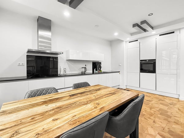 This bright and modern third-floor apartment offers over 100 m² of living space, a balcony of approximately 12 m², and a private parking space. The apartment is furnished and features new flooring, a kitchen, and a bathroom.