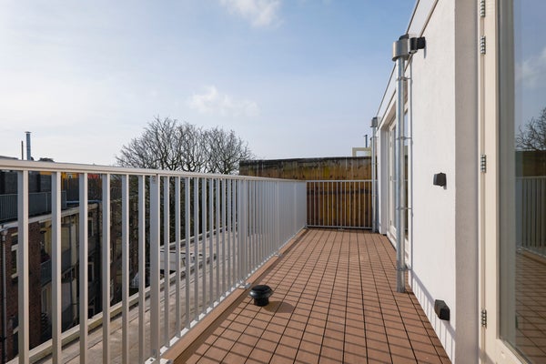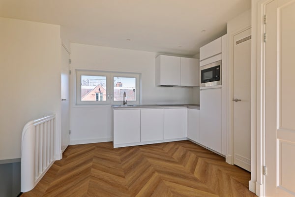 Through the shared hallway, you reach your own staircase, which leads directly to the open living space of the apartment. The open living space, consisting of a spacious kitchen with built-in appliances and living room, is the heart of the apartment. Thanks to the large windows, a lot of natural light flows in, making the space feel particularly airy and bright. From the living room, you have access to the fantastic rooftop terrace. This is the perfect place to enjoy the sun or host a cozy lunch outdoors.