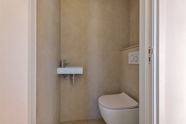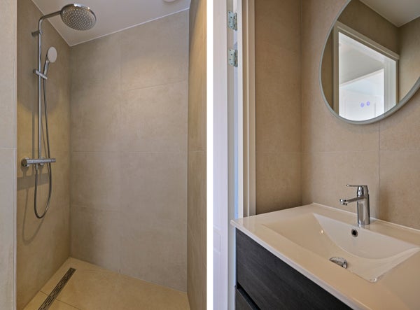 The apartment has two bedrooms: one at the back of the building and one at the front. The modern bathroom features a luxurious rain shower and a washbasin. Additionally, there is a separate toilet, providing extra comfort and privacy.