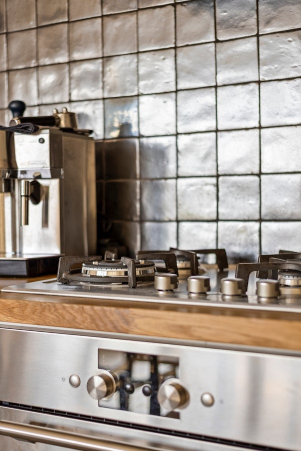 Adjacent to the living room is the open-plan kitchen, equipped with a gas stove and a fridge-freezer combination. It also features a cozy bar and dining area, perfect for daily use and social moments.