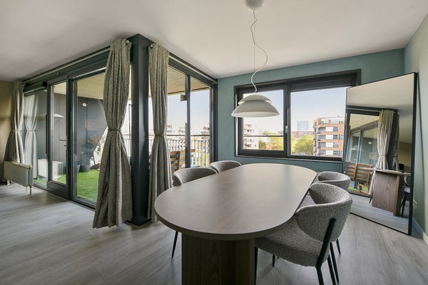 Modern, spacious and well-maintained 2-bedroom apartment of 97m2 in apartment complex Geuzenpoort. The apartment is situated on the 5th floor and has a lovely green view over the area.