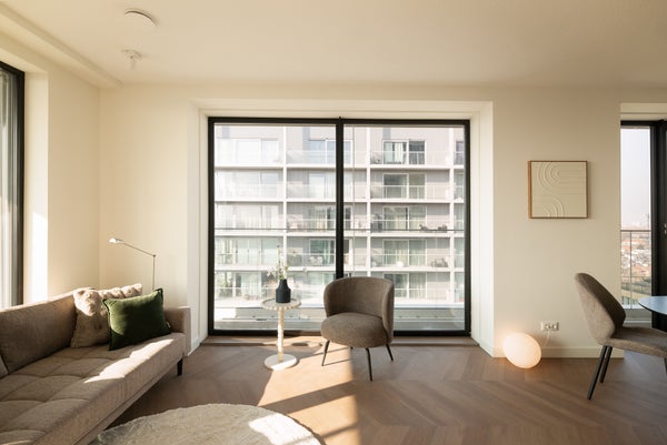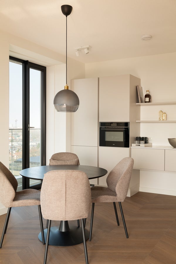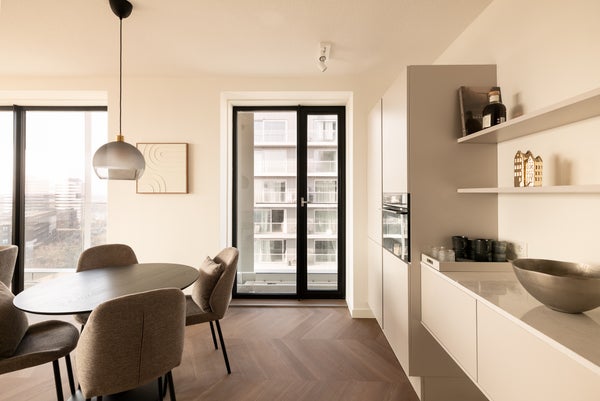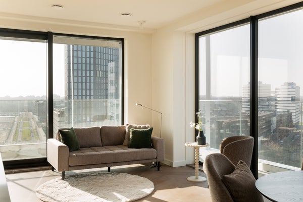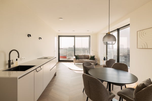 Located on the 12th floor of The Starling, this high-quality, fully furnished three-room apartment offers spectacular views over the city, including the Amstel River and the Amsterdam skyline. Thanks to its corner position and large windows, the apartment enjoys abundant natural light throughout the day.