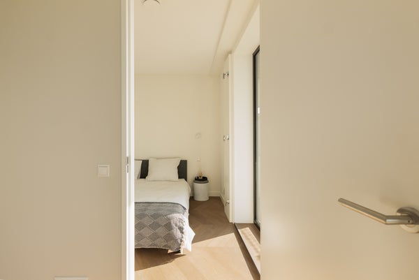 The living room opens onto the large south west-facing balcony, a perfect spot to relax and enjoy the sun. The main bedroom also has direct access to the balcony, seamlessly connecting indoor and outdoor living. The stylish en-suite bathroom features a comfortable walk?in shower and washbasin. Throughout the apartment, underfloor heating and cooling ensure a pleasant indoor climate year?round.