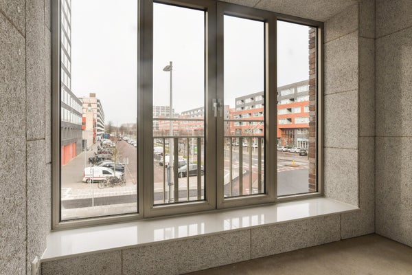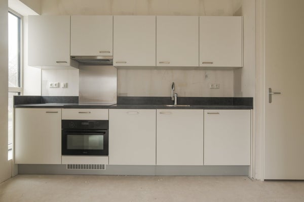 The bright living room with large windows offers a lovely view. The open kitchen is equipped with modern appliances. A loggia connects to the living area and can be closed off with glass sliding doors.