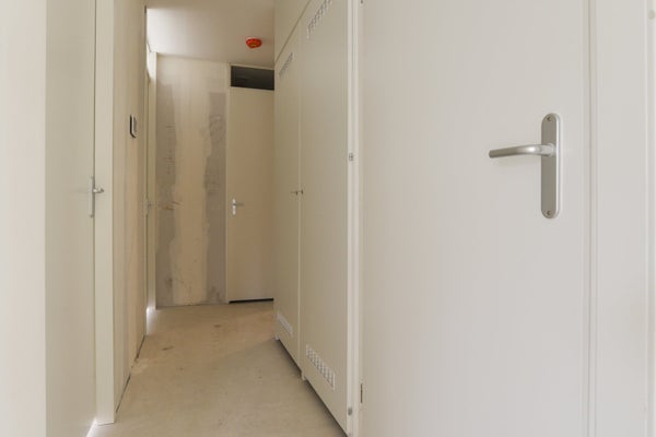 Upon entry, a spacious hallway welcomes you. To the right is a modern bathroom and to the left a tidy toilet. Further down the hall, there are two rooms: a spacious master bedroom and a smaller room suitable as an office or child's room. The hall also leads to a storage with a washing machine connection.