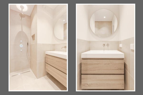The apartment has two spacious bedrooms, both with their own bathroom and a practical built-in closet. The bedroom at the rear provides direct access to the balcony.