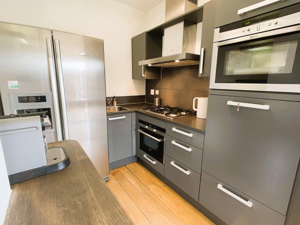 The apartment is accessed via a neat entrance hall with space for coats and shoes. The spacious living room benefits from large windows, allowing plenty of natural light to enter. The open-plan kitchen connects seamlessly to the living area and is fully equipped with modern appliances.
