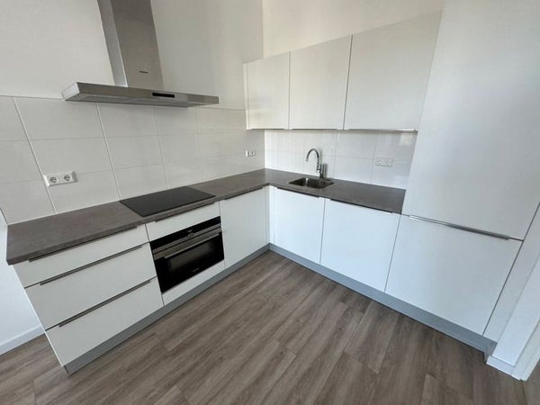 Lichte royale woonkamer met aan de achterzijde toegang tot het balkon. Open keuken met inbouwapparatuur zoals een vaatwasser, combi-oven, koel-/ vriescombinatie en inductiekookplaat.