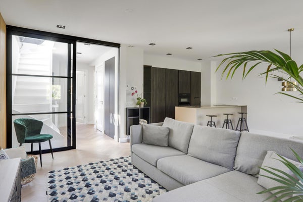 At the rear, there are two (bed)rooms. The master bedroom has fitted wardrobes and gives access to the panelled balcony. The second (bed)room also has a built-in closet. The bathroom has a double walk-in shower and a double sink with a cabinet. In the hallway of the house is a storage room with washer and dryer connections and there is a separate toilet.