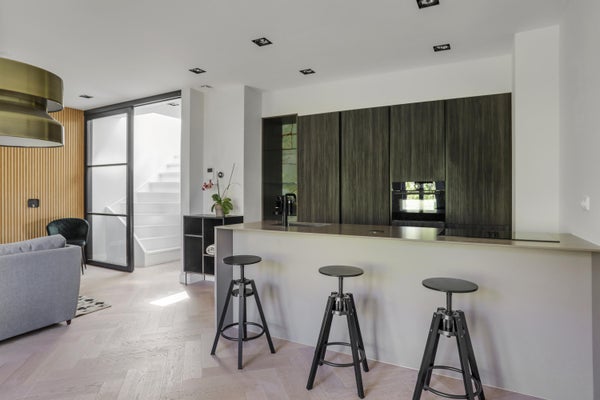 Through the common staircase, you reach the entrance of the house. Upon entering the apartment on the third floor you enter the living room on the right which has a very luxurious kitchen with a kitchen island and finishes of green onyx. A large number of windows and the light-coloured oak herringbone floor provide a very open and light space.