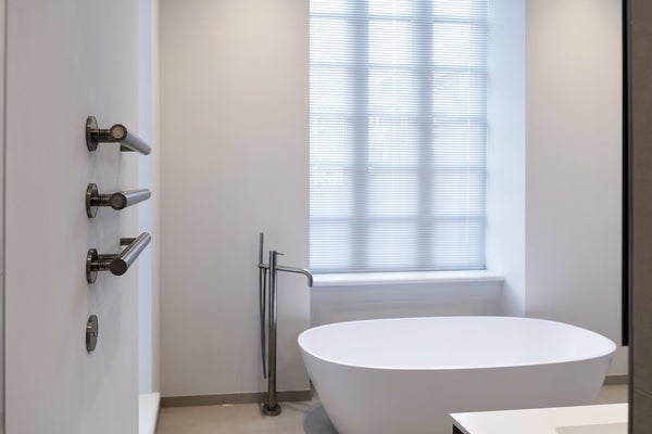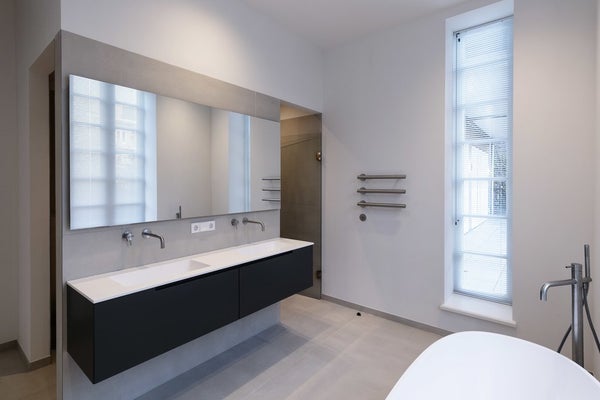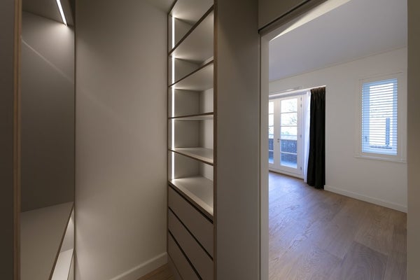 The two spacious master bedrooms are to the right of the entrance. The rear bedroom features a walk-in closet, French doors to a balcony and a luxury connecting bathroom - the ultimate boutique hotel feel. The bathroom is equipped with a free-standing bathtub, walk-in shower, toilet and a custom made vanity. The original, characteristic windows lend a unique sense of space. The second spacious bedroom at the front with a connecting bathroom and fitted closets offers a unique view of Noorder Amstelkanaal.