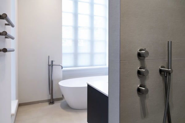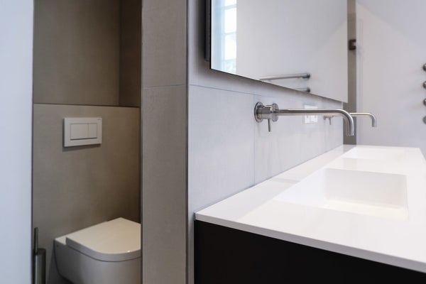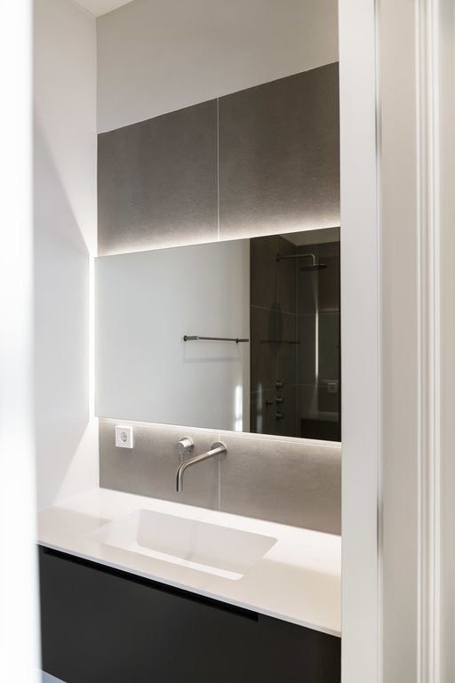 Both bathrooms feature high-end finishes, with Gigacar ceramic tiles and Monolith sinks.
