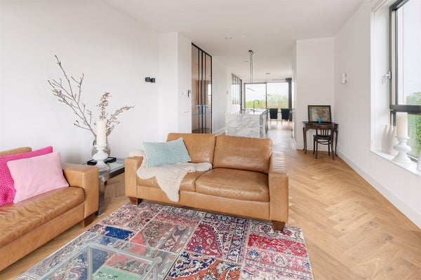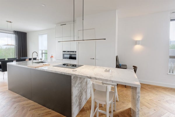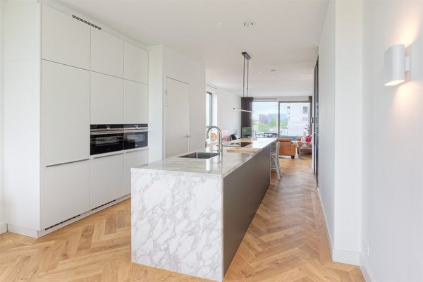 From the street through the underpass, through the communal courtyard building C. A red marble clad hall with elevator. Entrance hall with cloakroom, laundry room/storage room and toilet with hand basin. Entrance to the living room through the glass/steel door. The living room and the sitting room are separated by the oversized kitchen island of marble look worktop. In the north side of the living room is the spacious dining table followed by the office or second bedroom, which is separated by a black glass/steel front. From the dining area you have a beautiful view over the main sailing route of the Zuider Amstelkanaal.