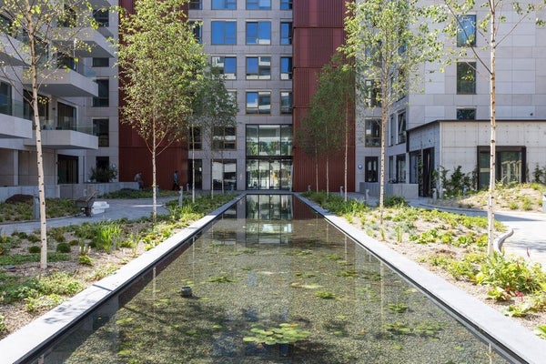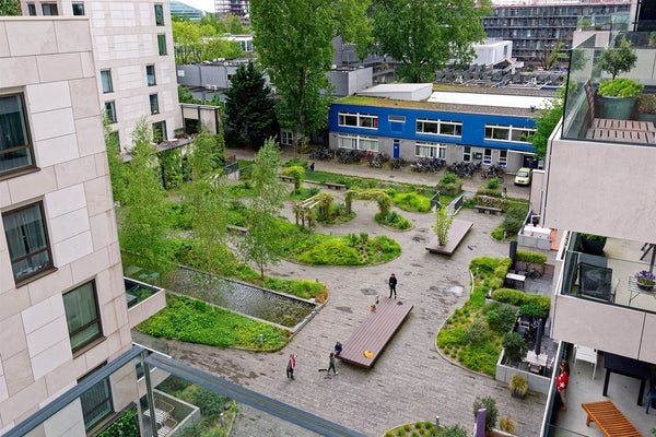 De Fred is a modern and beautifully designed apartment complex consisting of three buildings, one of which was built on the banks of the Zuider Amstel Canal, overlooking the Stadionkade. For residents there is a beautifully landscaped courtyard with numerous cozy seating areas, pergolas and flowering plants.