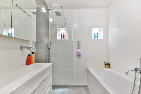 The luxurious bathroom has a large walk-in rain shower, a bath and double sink and cupboard space.