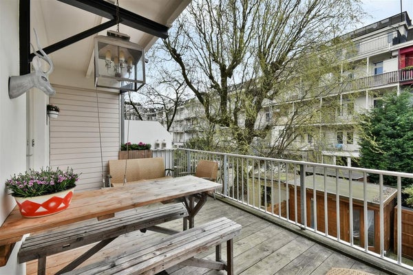 The apartment is located in a no-car section of the street, directly overlooking a square with trees. The buildings opposite the street are lower, which causes extra light to come in.