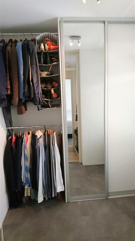 The open kitchen with a bar is fully equipped with all essential appliances. The spacious bedroom includes a built-in wardrobe, while the second room is currently used as a walk-in closet with large custom-fitted wardrobes.