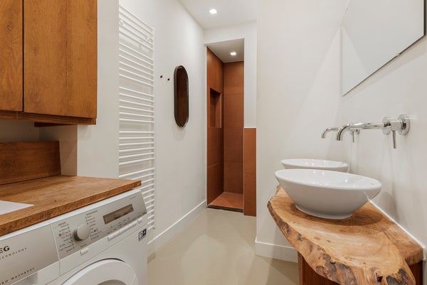 At the rear of the apartment, you will find the bathroom and a separate toilet. This bathroom is equipped with a comfortable rain shower, a sink with double washbasins, a toilet, a design radiator, and a connection for the washing machine. Also located at the back of the property is the first spacious bedroom.