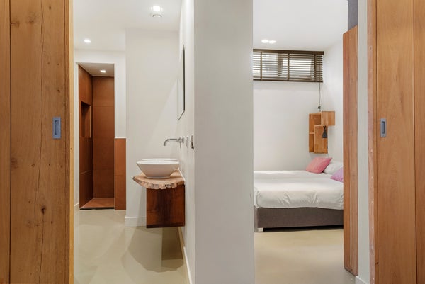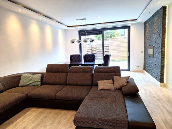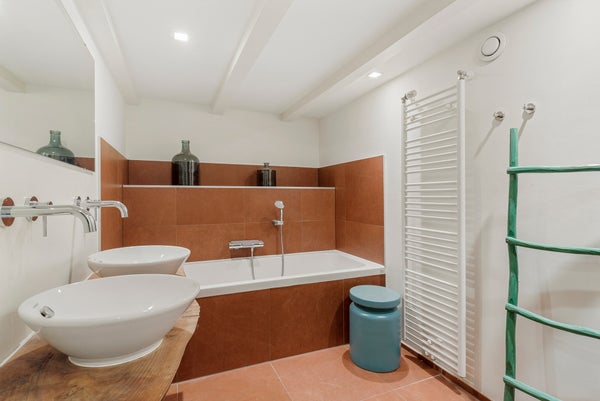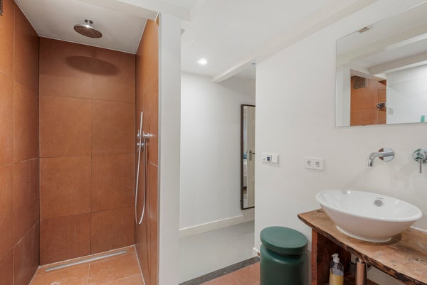 Via the stairs, you reach the basement where the second spacious bedroom is located. Thanks to the high windows at the front, pleasant daylight enters the room. Here you will also find the second bathroom. This bathroom is tiled and equipped with a comfortable bathtub, a rain shower, a sink with double washbasins, and a design radiator.