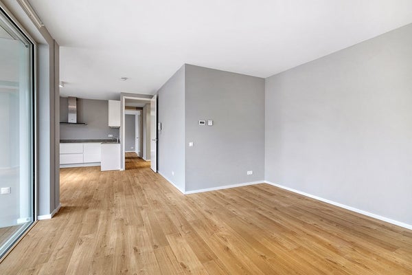 Access through a common entrance on the second floor (with elevator). Entry into the hall which provides access to all rooms. Very spacious and bright living room at the front. Open kitchen which is equipped with all necessary appliances. Space for a spacious dining table and seating area. Terrace accessible through sliding doors. Spacious master bedroom and a second bedroom which serves great as a study, children's and/or guest room. Bathroom with bath, shower and double sink. Toilet. Separate room with connection for washing machine and dryer. Indoor parking and storage also belong to the apartment. The apartment has been finished to a high standard down to the details and will be delivered with blinds and/or curtains.