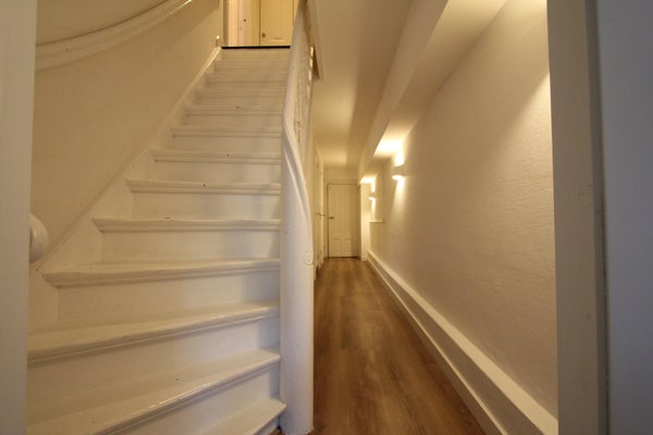 A staircase leads down to the cellar level, where a central hallway provides access to all rooms. The first bedroom is positioned at the rear and features large windows and French doors opening onto the garden. The spacious master bedroom also overlooks the garden and includes fitted wardrobes and French doors providing direct outdoor access. The large centrally located family bathroom is new and equipped with a bathtub, separate walk-in rain shower, toilet, double sink, and a washer and dryer. At the front of this floor is the third generously sized bedroom situated next to additional storage space.