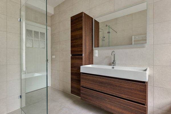 Via the communal staircase, there is access to the apartment on the second floor. At the front of the apartment is the living room. The living room has ensuite doors to the dining area with French doors to the sunny balcony. The kitchen is equipped with modern appliances including a refrigerator, gas stove, dishwasher, and microwave/oven combination. Also at the rear is the bedroom with air conditioning. In the hallway, there is access to the bathroom with a walk-in shower, bathtub, and sink. There is a separate toilet.