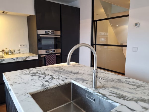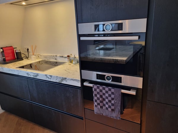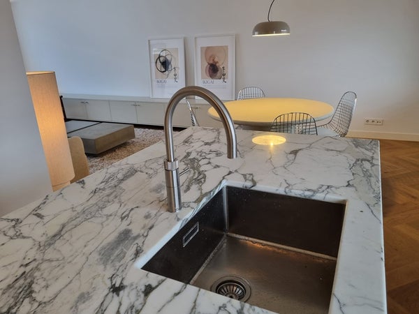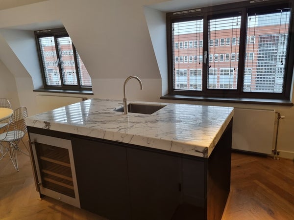 The apartment features a generous open-plan living, dining and kitchen area, all finished to an immaculate standard. The kitchen is truly outstanding, featuring thick grey and white marble countertops, a large feature island with integrated sink and wine fridge, and extensive built-in drawer storage. High-end appliances include an induction hob, double oven, dishwasher, and a convenient Quooker hot water tap. The kitchen and dining area enjoy views over the city and surrounding canals, making it an ideal space for entertaining.
