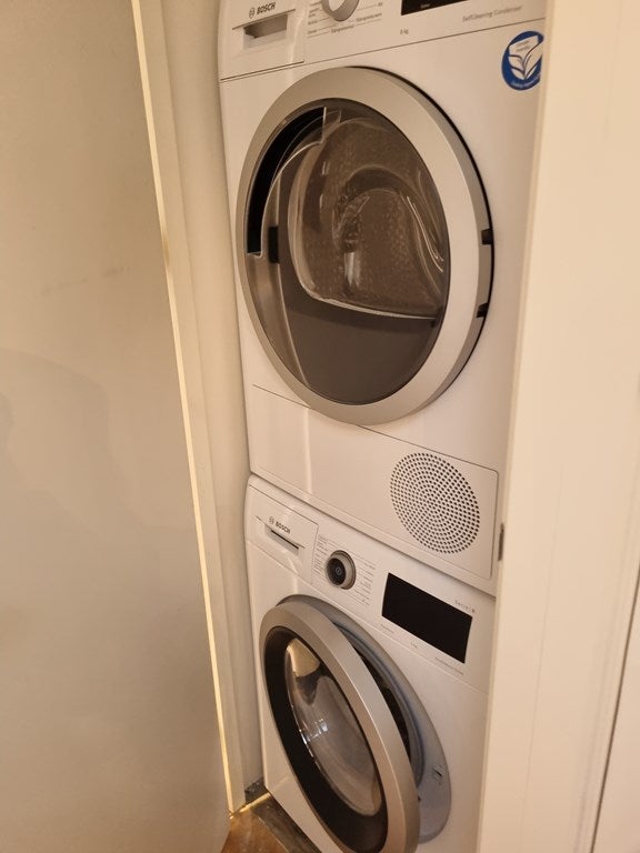 There is excellent storage throughout the apartment, with thoughtful design details evident in everything from the door handles to the soft furnishings. Practical amenities include a high-spec washing machine and a separate dryer.