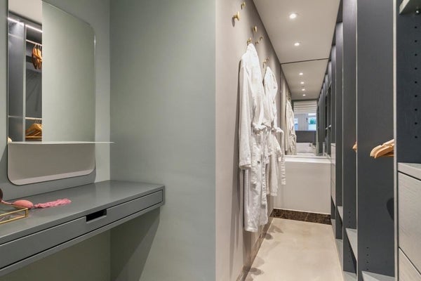The apartment has a luxurious bathroom with walk-in shower and double washbasin.