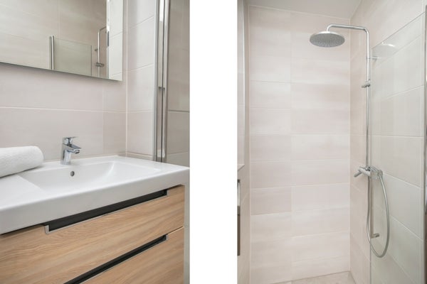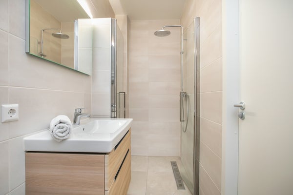 The bedrooms are located at the front and are both suitable for a double bed. The bathroom has a bathtub, a very comfortable walk-in shower, washbasin cabinet with double taps, bathroom mirror with LED lighting, mechanical ventilation and underfloor heating. The whole is done in neutral colors. In the hallway is a separate toilet and an indoor storage room with plumbing for washer and dryer.
