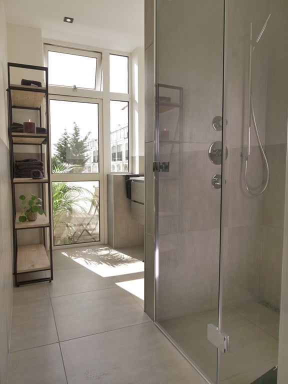 The separate toilet and storage cupboard are centrally located in the house. You will also find the washer / dryer combination and the central heating boiler in the hall. The entire apartment has underfloor heating and the ceilings have recessed spotlights. The floors have a herringbone wooden floor.