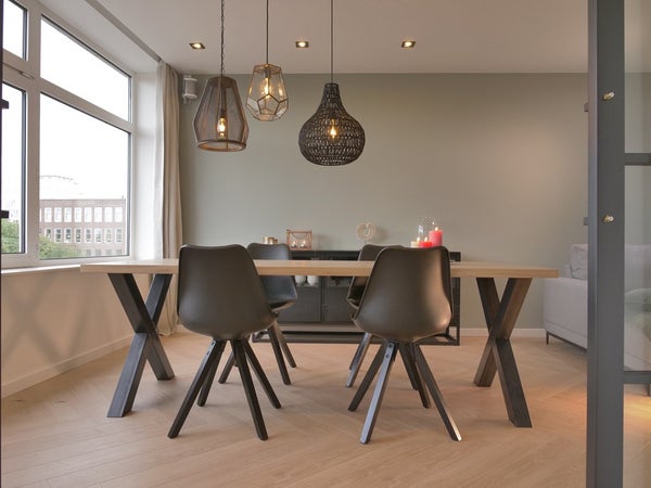 The open kitchen is equipped with built-in appliances such as an electric stove, refrigerator, separate freezer, a quooker for boiling hot water and a combi microwave oven. Through the sliding glass doors you enter the living room which is equipped with a beautiful oak dining table and a lovely lounge sofa with a 55-inch TV to relax. For the right atmosphere in the living room, you can easily set lighting and sound via your mobile.