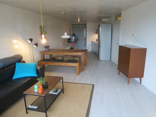 All rooms in the apartment can be reached via the entrance hall on the 6th floor. You enter the living room and immediately notice the large windows. This allows a lot of natural light to enter the house, making it a wonderful place to stay. The living room is neatly finished with a laminate floor and furnished with a dining room table and luxurious sofa. You enter the balcony through the living room.