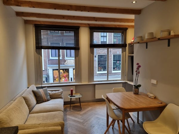 Upon entering, a private staircase leads to the first floor, where you arrive in the beautifully designed open-plan living and kitchen space. The living area is flooded with natural light from two large windows overlooking a picturesque traditional Amsterdam street and benefits from excellent insulation, ensuring comfort and tranquillity year-round. Exposed wooden roof beams, subtle spotlighting, elegant herringbone flooring, and carefully chosen furnishings create a warm and refined atmosphere.