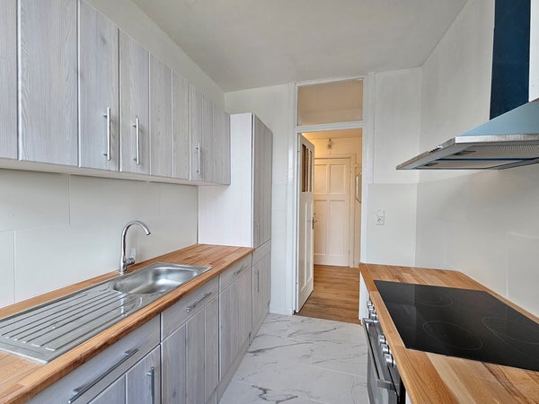 On one side of the living room is the apartment kitchen (ca.2.75 x 2.12 = 5.93m2) with 4-burner induction hob, extractor, single sink, fridge freezer, large oven, dishwasher, tiles on the floor and lots of cupboard space.