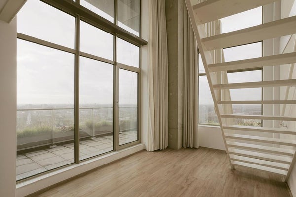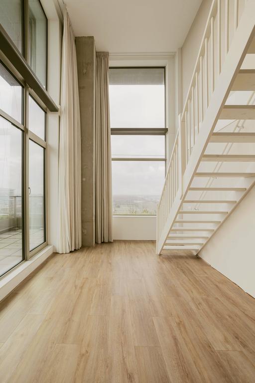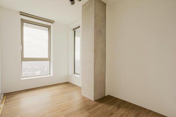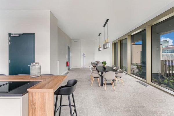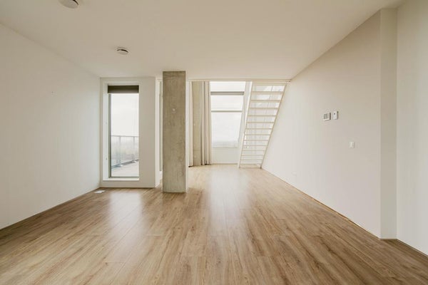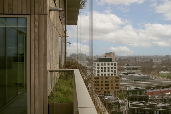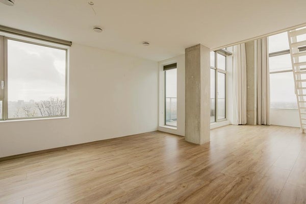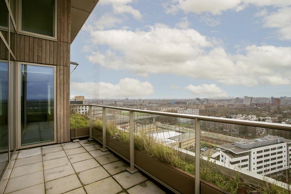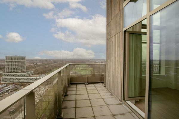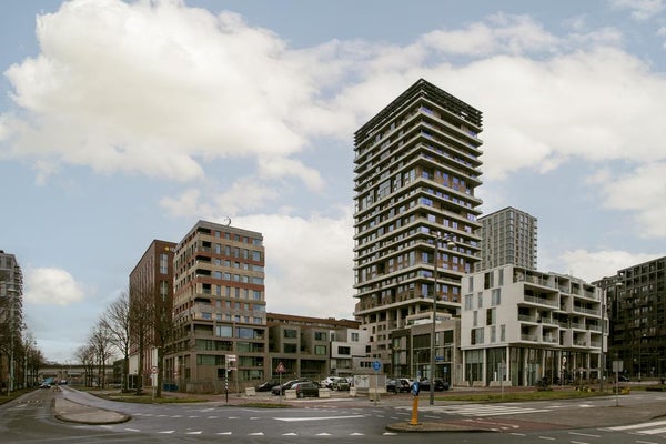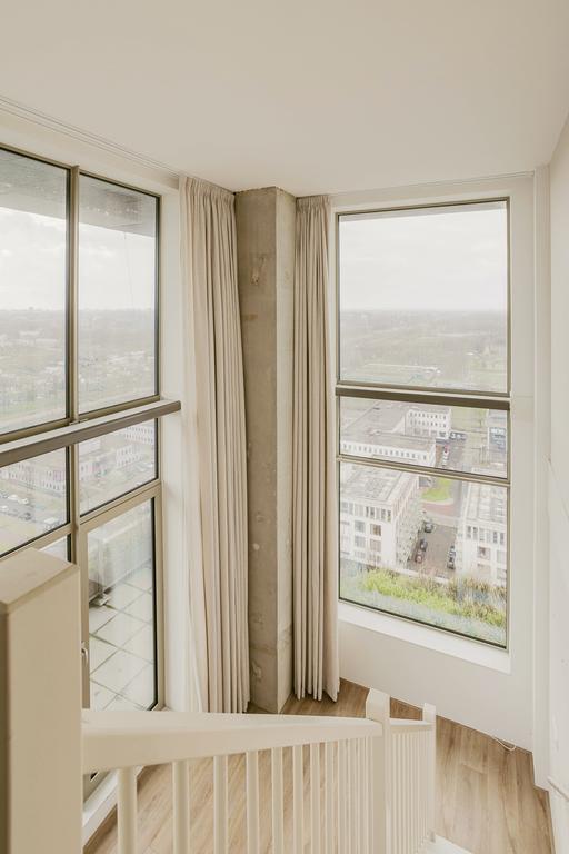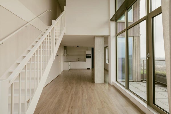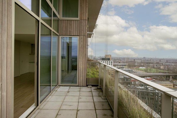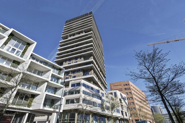 Very exclusive duplex corner apartment of 87 m2 with a terrace on the 14th floor of the Vertical building. The luxuriously finished apartment is rented including upholstery, bicycle parking spaces and an optional parking space. The house has a living room of approx. 40 m2 with two floor high windows on the corner. The southwest facing terrace is approx. 10 m2.