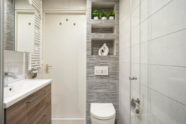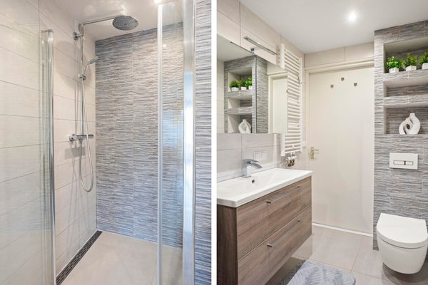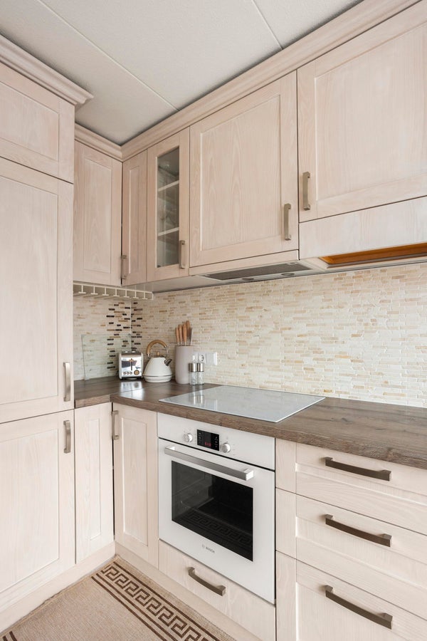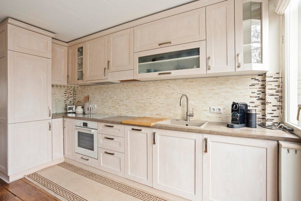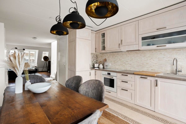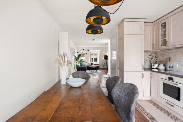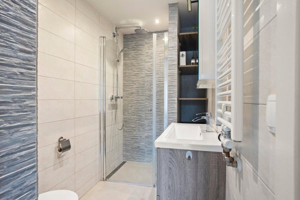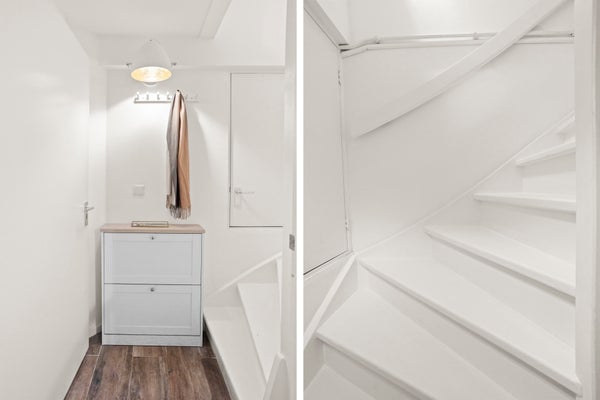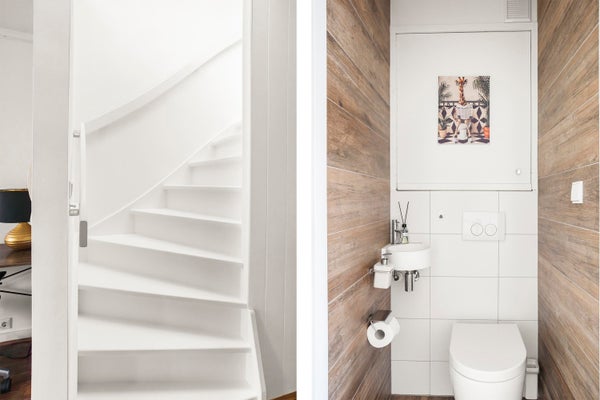 The apartment is spread over several levels. The 1st floor features the bedroom with a large wardrobe & bathroom. The 2nd floor offers the living room with an open-plan kitchen, including a dining table, as well as a separate toilet.