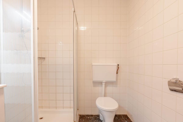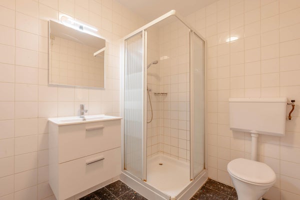The apartment offers two generous bedrooms, ideal for two working sharers or for anyone seeking extra space for a home office. The well-maintained bathroom includes a shower, toilet, and a vanity unit.