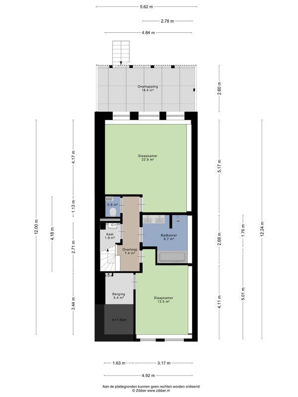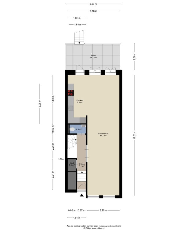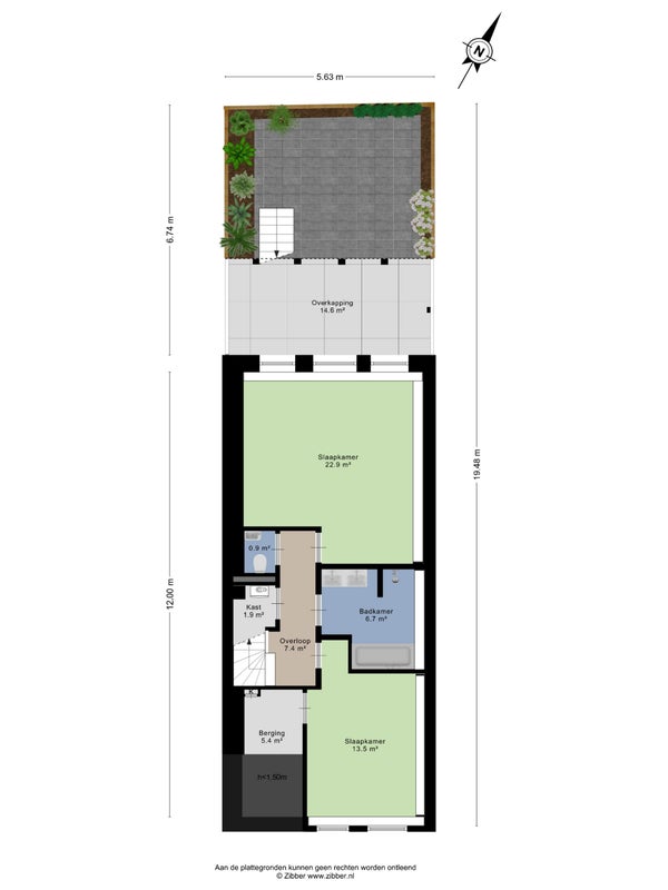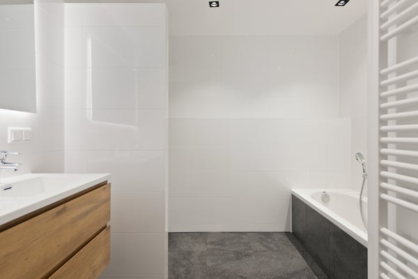Entering through the private entrance, you step into the bright and airy living room. At the rear, you will find the modern open kitchen, equipped with an induction hob, dishwasher, extractor hood, fridge and freezer. The French doors open onto the large veranda — an inviting spot to relax. From the veranda, a staircase leads down to the northwest-facing garden, ideal for anyone looking for a sheltered and peaceful outdoor space.