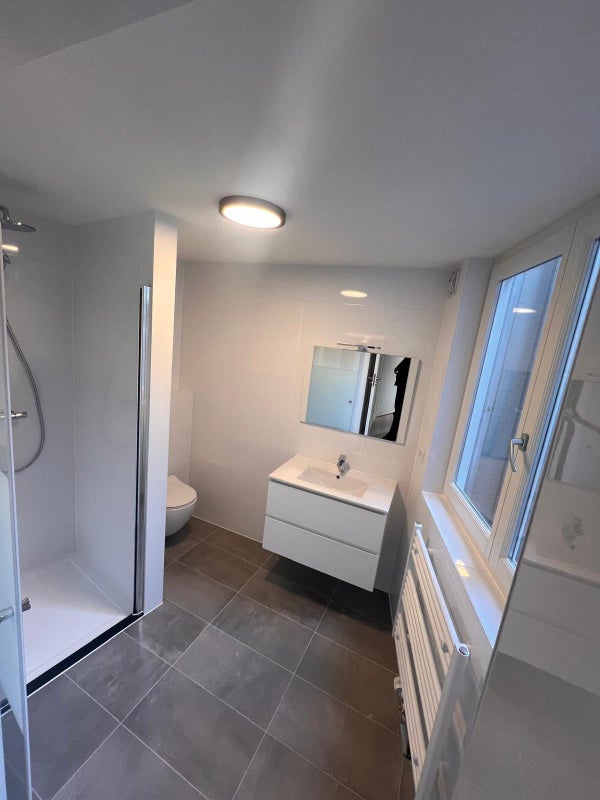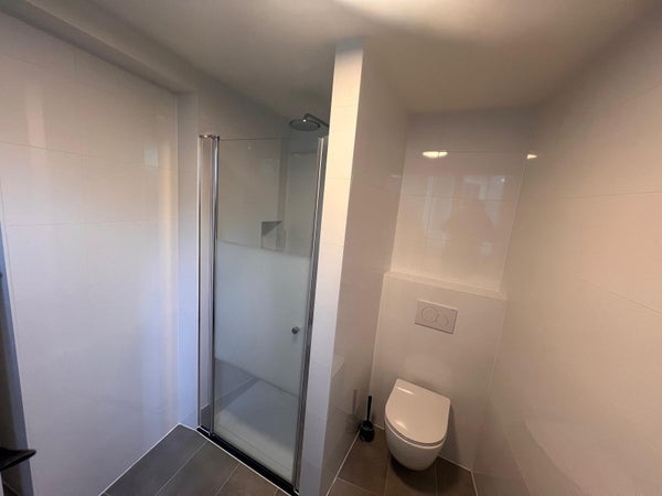 The contemporary bathroom features a walk-in rain shower, washbasin, washer/dryer connection, and a toilet, finished to a high standard.