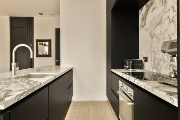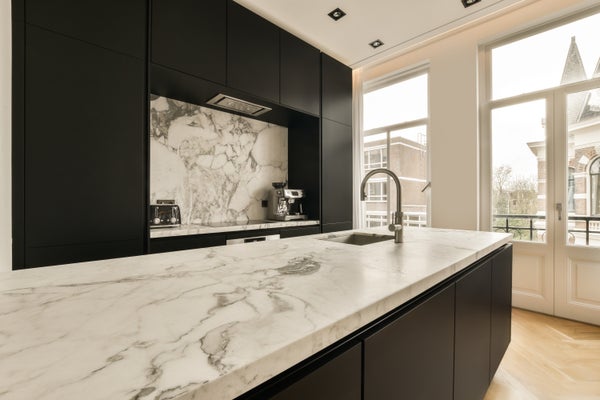 Entrance in the spacious living area, where the impressive width and natural light immediately stand out. The open plan kitchen is fully equipped with high-end built in appliances, marble details, and a wine climate cabinet.