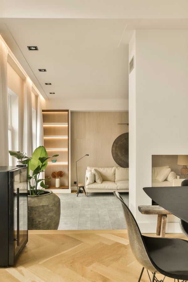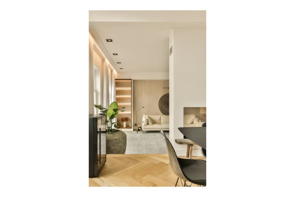 The dining area adjoins the kitchen and is stylishly connected to the living room by a gas fireplace. The living room is positioned slightly lower than the dining area, creating a playful and architectural effect. Custom-built cabinets with dimmable lighting add warmth and atmosphere to the room.