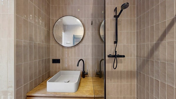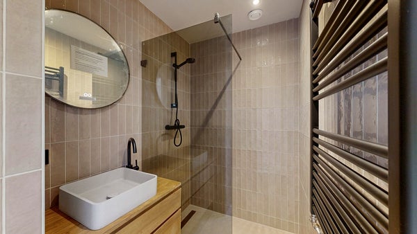 The upper floor hosts three bedrooms. The first bedroom is located at the front and features built-in wardrobes—perfect as a guest room or a home office. The boutique-style bathroom is finished with stunning wall and floor tiles, featuring a walk-in rainfall shower, a modern vanity with an illuminated mirror, and a designer towel radiator.