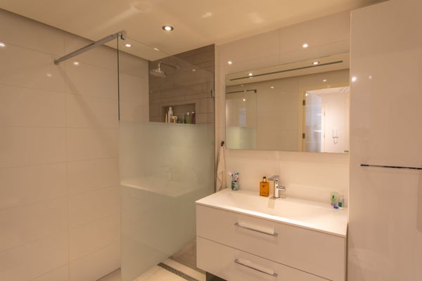 Kitchen: You enter the apartment in the central hall. Right next to the entrance, we enter the fully equipped kitchen. The kitchen includes a dishwasher, induction cooker, microwave, oven, fridge, and freezer. The bar is perfect for having breakfast. Next to the kitchen, you will find storage space.