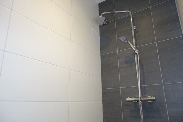 The bathroom has a double sink, bathtub, and walk-in shower. The toilet is separate from the bathroom.