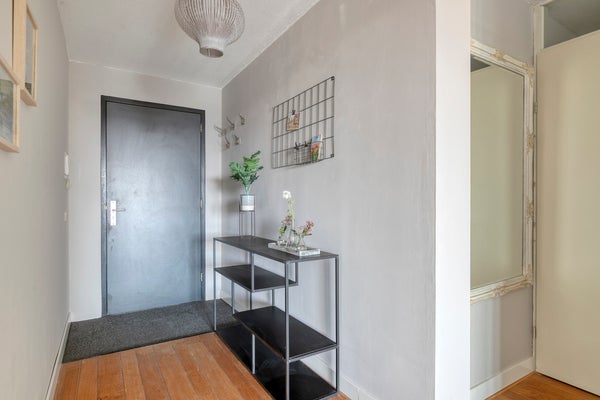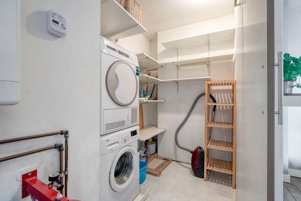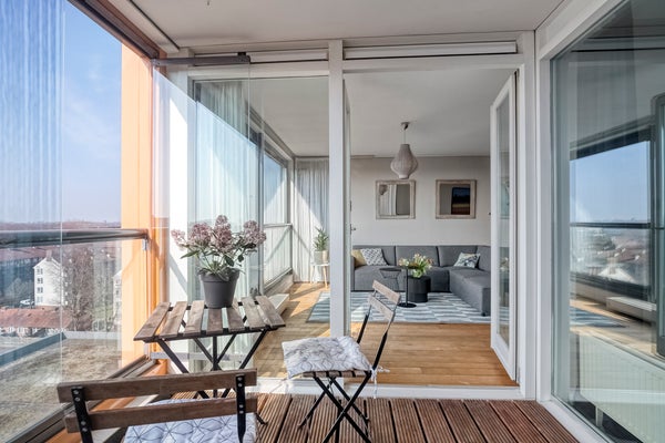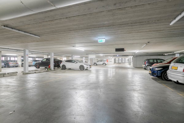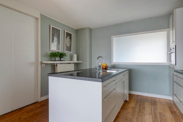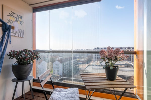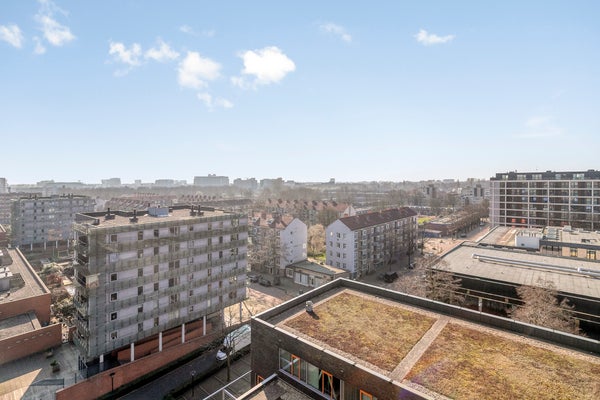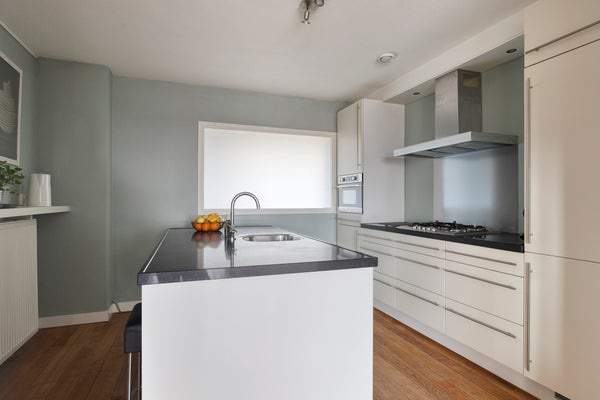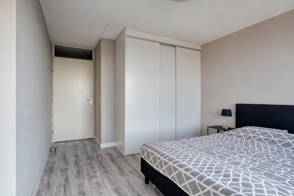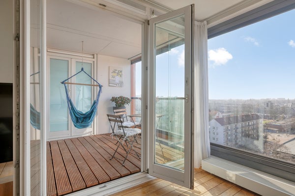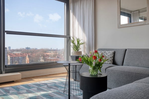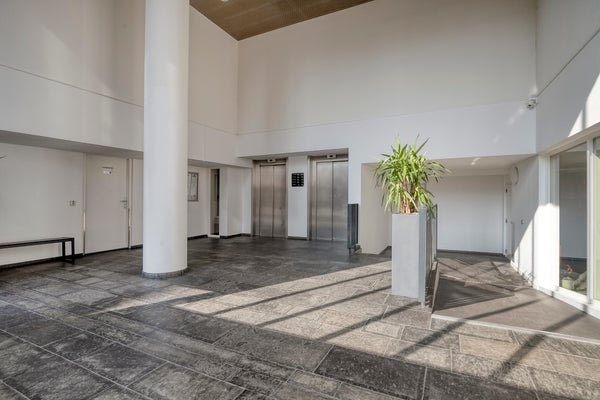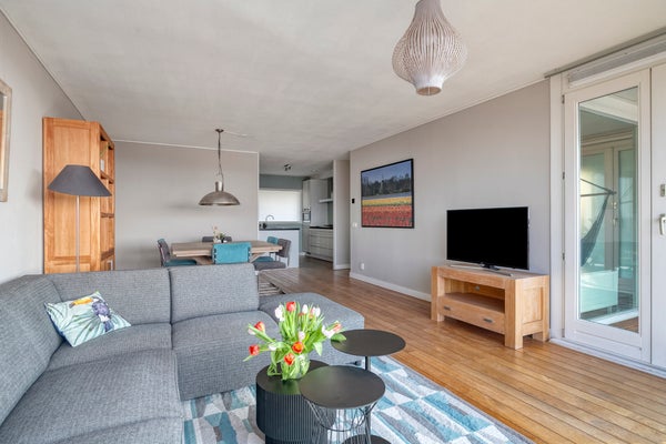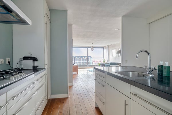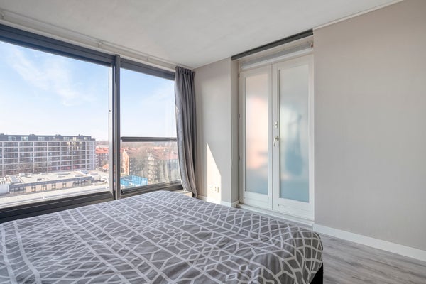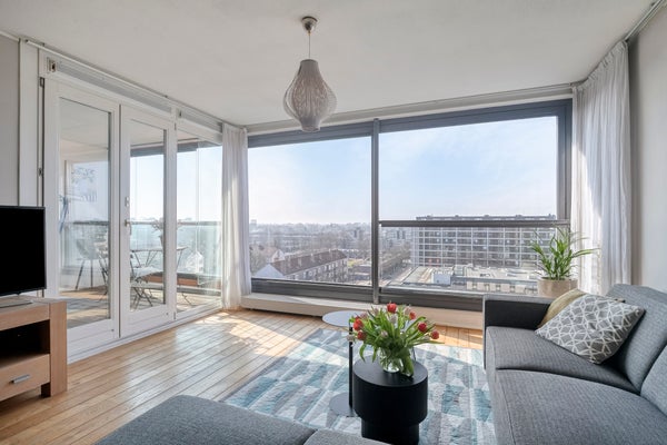 The building is entered via a secure communal entrance. The apartment is located on the 8th floor and can be reached via an elevator. The apartment has a spacious hallway which leads to the living area, 2 bedrooms, bathroom and seperate toilet. The spacious and bright living room has got large windows and let in much natural light. The open plan kitchen has a kitchen island with bar stools and is equipped with built-in appliances such as a dishwasher, fridge/freezer, combi-oven. There is a shelved storage area with a washing machine and dryer.